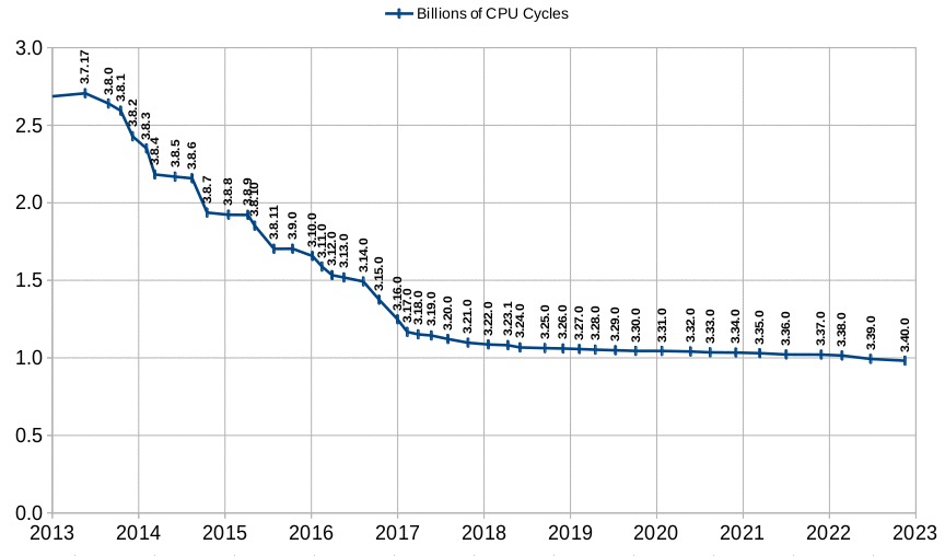 A psychological milestone: The performance benchmark that the SQLite developers have used for many years has for the first time dropped below 1 billion CPU cycles (measured using cachegrind) when run in WAL mode. This is less than half the number of CPU cycles used as recently as 8 years ago. (The graph below shows SQLite using a rollback journal which uses fewer CPU cycles at the expense of extra I/O. The benchmark passed through the 1 billion cycle barrier for rollback journals for the previous release.)